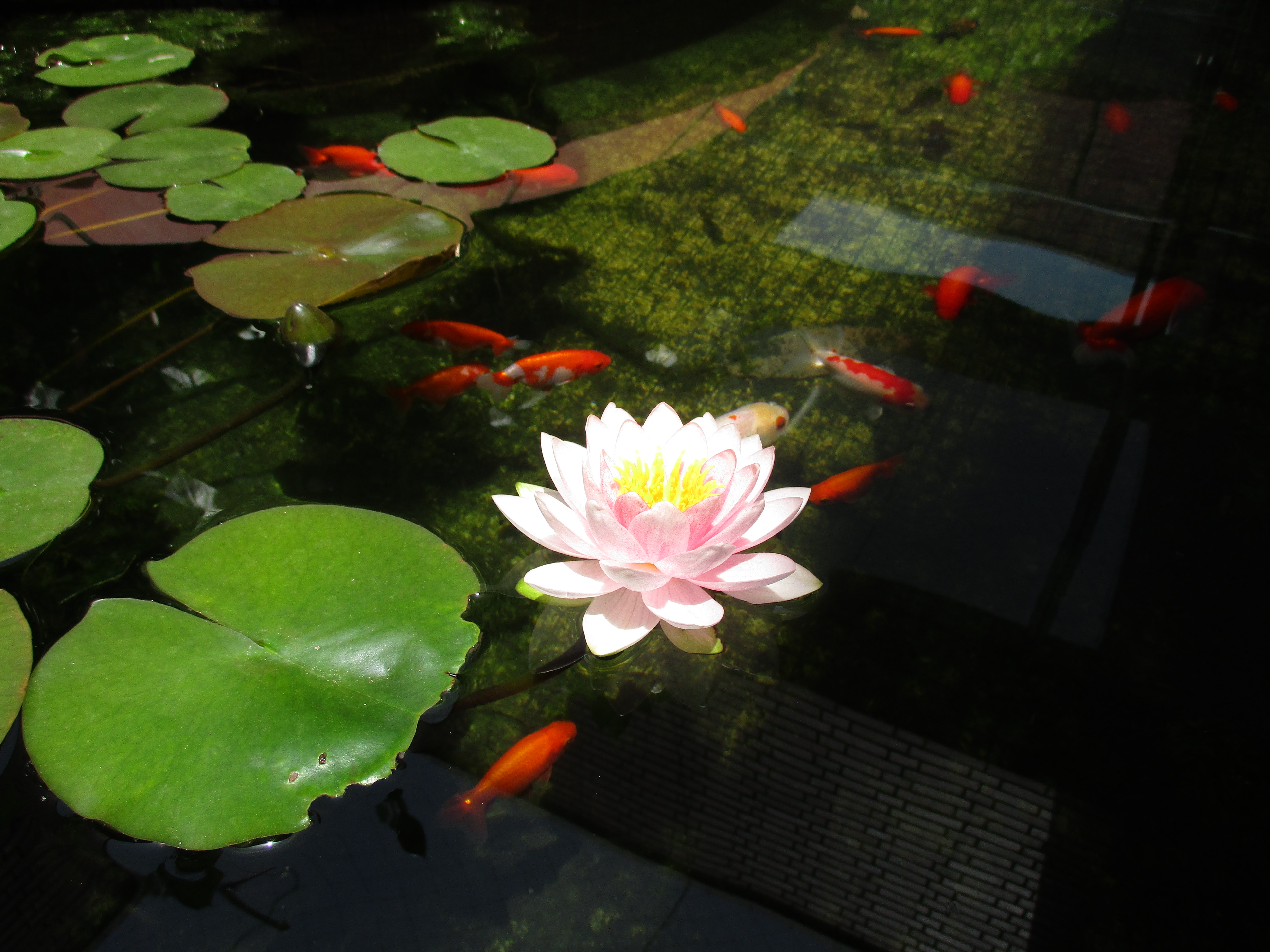 去年よりグッと成長したらんちゅ達もスイレンの開花に大喜びです。